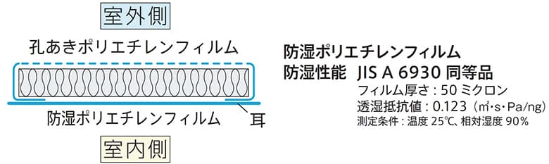 JIS A 6930 同等の防湿気密フィルム(50ミクロン厚)付属の製品です。