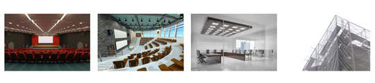 ・吸音、断熱を必要とする、会議室や多目的ホール、ホームシアターなどの内装仕上げや音の響きを調整するためにオフィスビル、シネマコンプレックス、店舗、工場、体育館などにグラスウールが使われています。