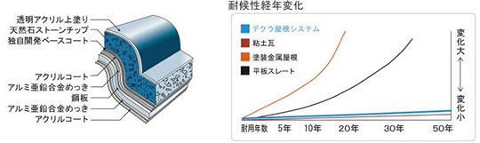 鋼板をプレス成形加工後アクリルコートで保護し、表面に独自開発したベースコートを二重コーティング、天然石ストーンチップを焼付け加工後、トップコートを施した独自の8層構造で耐久性に優れた屋根材です。