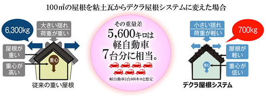 デクラ屋根システムは一般的な粘土瓦の重量の約1/9の軽さ
