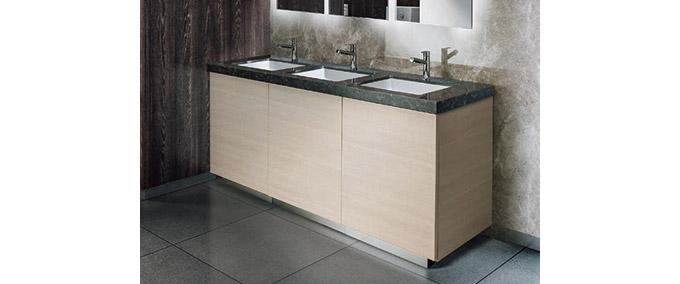 ■ 洗面下パネルの表面材は、水・汚れ・傷に強いメラミン化粧板です。ポストフォーム仕様(曲げ加工)のため木口がはがれる恐れがなく、安全性にも優れています。色柄バリエーションが豊富で、カウンターや壁面材と意匠のコーディネートが可能です。