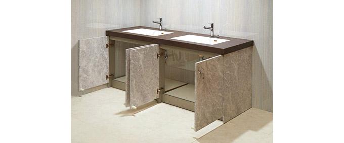 近年、トイレ空間は、商業施設・交通施設・病院・学校・オフィス・ホテルなどの施設のイメージを左右する重要な空間として存在感を高めています。メラミン化粧板、メタクリル樹脂系人工大理石、高級人造石などを用いた当社の洗面カウンターは、優れた意匠性・耐久性・メンテナンス性が評価され、公共施設のトイレ空間で数多く採用されています。また、現場のサイズに合わせてミリ単位で1本からオーダーできる点もご好評いただいています。