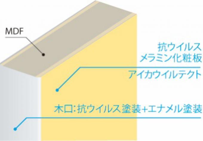 新型コロナウイルス感染症の流行により、まなブースが多く使用される育児施設においてもウイルス対策が強化され、保育士や施設関係者の負担が増大しています。そこで、抗ウイルス仕様の「まなブースウイルテクト」を発売しました。表面材には、メラミン化粧板に抗ウイルス・抗菌性能を付加した「アイカウイルテクト」を使用しています。「アイカウイルテクト」は抗ウイルス剤・抗菌剤を練り込んでいるため、効果が長期間持続し、頻繁に拭き掃除を行っても性能低下がほとんどありません。また、メラミン化粧板の優れた物性を維持しているため耐薬品性に優れており、消毒作業にアルコールや次亜塩素酸ナトリウムなどの薬剤を使用しても表面が劣化しにくく、美観の維持が期待できます。扉の開閉時に手が触れやすい木口部分も、抗ウイルス・抗菌仕様としています。