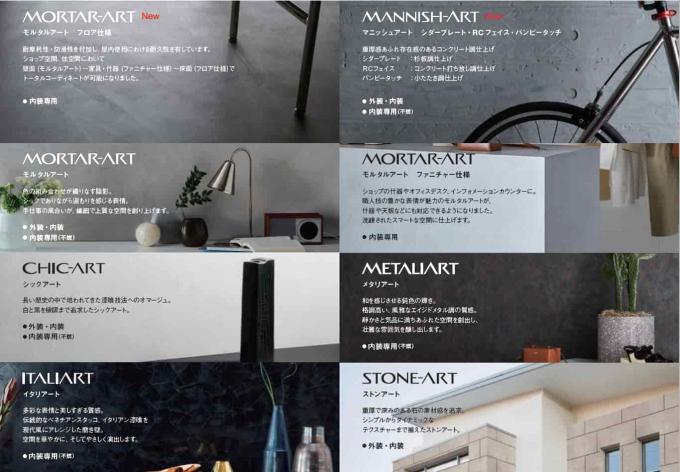 このたび、屋内フロアへの施工が可能な「モルタルアート フロア仕様」と、重厚感あふれるコンクリート調仕上げが特長の「マニッシュアート」が、ラインナップに加わりました。