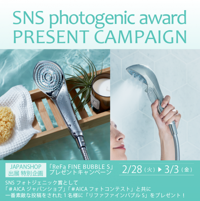 展示会の写真をSNS (Instagram/Facebook/Twitter)にてハッシュタグ「#AICAジャパンショップ」「#AICAフォトコンテスト」と共に一番素敵な投稿をされた1名様にフォトジェニック賞として「リファファインバブル S」をプレゼントいたします!