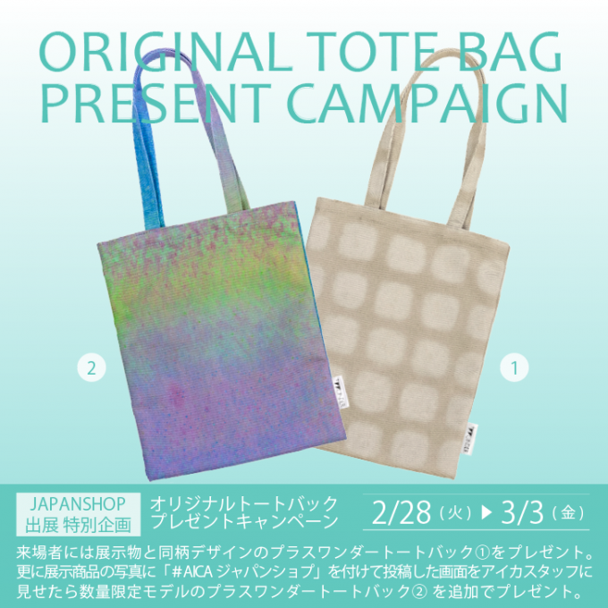 それだけではありません!展示ブースの中にご用意している映えスポットなどで撮影された写真をハッシュタグ「#AICAジャパンショップ」と共にInstagram/Facebook/Twitterにて投稿した画面をアイカスタッフにお見せいただくと数量限定モデルのプラスワンダートートバッグ(下記写真②)を追加でプレゼントします。