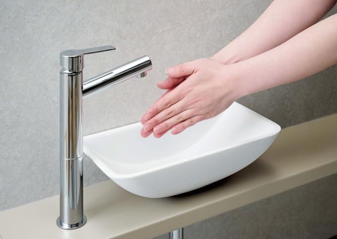 奥行き150mmのカウンターにぴたりと納まるスリムさと、手を洗うのに十分な容量を両立させた、専用の手洗いボウルを開発しました。人気のあるスクエア型のシンプルな意匠で、インテリアになじみます。