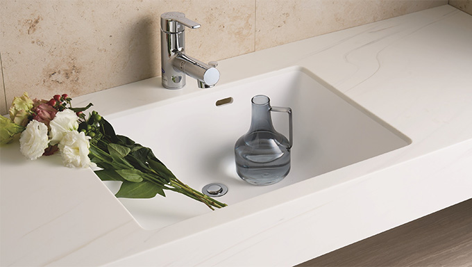 メタクリル樹脂系人工大理石のトップブランド「コーリアン®」製です。衝撃に強く、日常的な使用では割れ・欠けが起こりにくい素材です※。