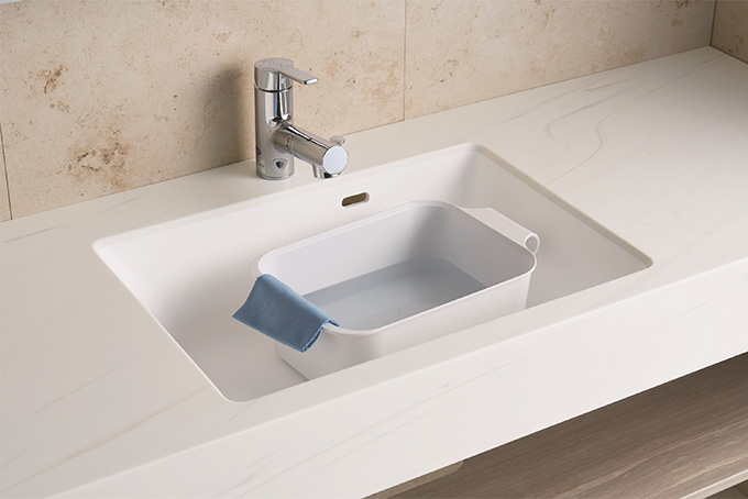 7月1日からは、オープンスタイルの「スマートサニタリーU」にて、シームアンダー深型ボウルがお選びいただけます。洋服などの浸け置き洗いや洗剤の詰め替え作業をする際はボウルに深さ・広さが欲しいというご要望を受け、新たに開発した洗面ボウルです。十分な深さをもたせつつ底面はフラットにすることで、バケツなどを置いての作業がしやすくなりました。また、シームアンダーデザインは、カウンター本体とボウルを段差なく接合しており、水や洗剤が飛んでしまっても拭きやすく、汚れ溜まりがないため日頃のお手入れも簡単です。