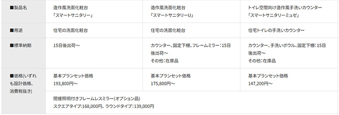 7月1日(火)からは浸け置き洗いなどに便利な深型ボウルがオープンスタイルの「スマートサニタリーU」で、7月22日(火)からはどんなカウンターにも合わせやすい間接照明付きミラーがシリーズ全体で、選択可能となります。