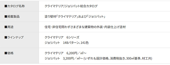 塗り壁材のカタログをリニューアル 発売50周年を迎える「ジョリパット」と上位ブランド「クライマテリア」の専用カタログを統合