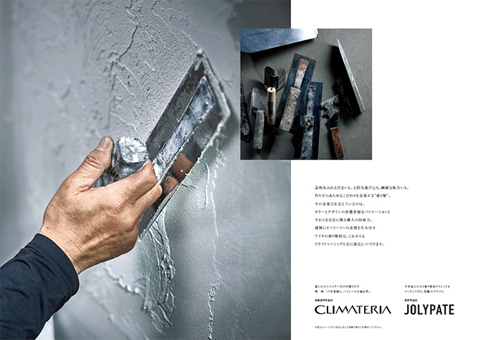 塗り壁材「ジョリパット」は、住宅、商業施設、ホテル・旅館、学校、駅、医療・福祉施設など、さまざまな建築物の外装・内装に使用されている建築用仕上げ塗材です。当社が1975年11月にフランスから日本に導入して以来、塗り壁材のパイオニアとして信頼と実績を重ね、成長してきました。2018年5月には、素材感と高級感を追求した上位ブランドとして「クライマテリア」を立ち上げ、モルタル調・石材調・金属錆び調の意匠が高く評価されています。