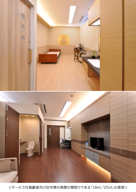 展示レイアウトはサービス付高齢者向け住宅等の実際の間取りである「18㎡」「25㎡」の居室のほか、「エントランス」「廊下」。ここに『医療・介護現場の声と最新の研究開発によるモノづくり』によって生まれた商品を中心に展示しています。