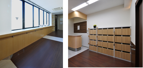 右(玄関収納):アイカヘルスケア玄関収納(ハードユースに耐え、だれもが使いやすいユニバーサルデザイン設計の施設向け玄関収納です)