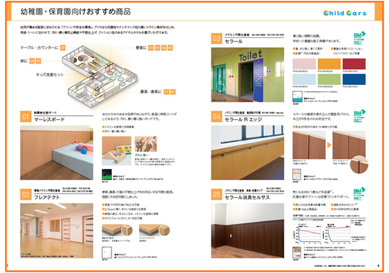 育児施設向け商品カタログは、抗菌性やメンテナンス性の高いメラミン化粧板を使用した商品をはじめ、