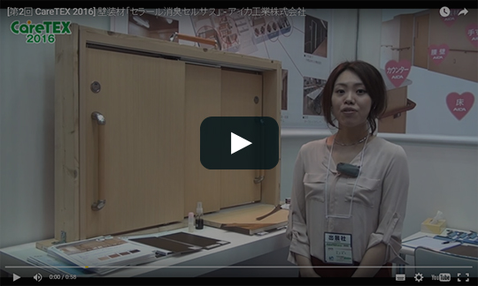 また、今回アイカ工業が出展した、住宅改修用品 / 建材のメラミン不燃化粧板「セラール消臭セルサス」は、医療介護現場で気になる生活臭の原因物質を低減する壁面材です。