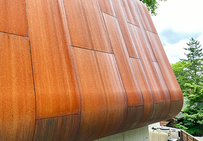 通常の鉄は錆びるととんどん腐食が進行していきますが、コールテン鋼は表面が錆びることで耐候性を獲得し内部まで腐食が進まない鋼材です。建築の外装材として使う大判から、表札やサインといった小さなものまで対応致します。