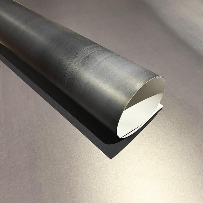 黒皮鉄板をスキャンにかけて実寸サイズで粘着付きフィルムにインクジェット印刷しており、 これまで難しかった様々なシーンでも黒皮鉄の表情を意匠として使える様になりました。