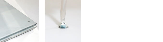 防音性を高めるためには、床に伝わる振動や音を防ぐことが重要。赤阪鐵工所オリジナルの浮床構造で高い防音性能を実現しています!また、床を支える支持脚はマイナスドライバーで高さ調整が可能。この独自構造を採用することで、設置場所を選ばず、凹凸のある床でもフラットな床面を実現できます。