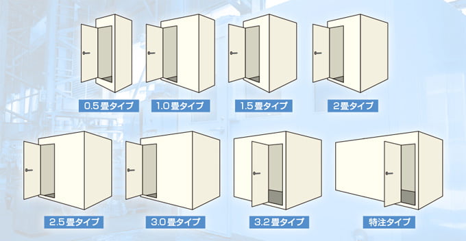 て不燃材料でできているため、建築基準法・消防法など各種法令の規制に適合することが出来ます。また構造体はスチールのため頑丈で耐久性があり、長期間の使用、移設・再組立てにも対応ができます。設置場所や用途に合わせて様々な大きさのタイプをご用意しています。また、特注も可能ですので、お気軽にご相談ください。