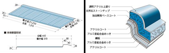 ※ガルバリウム鋼板をプレス成形加工後、両面をアクリルコートで保護してあります。