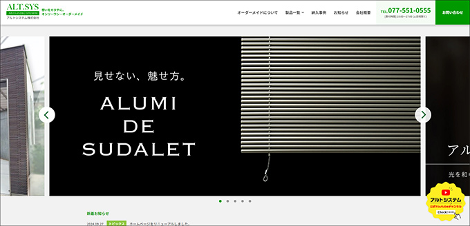 今回ご紹介の「アルミdeすだれ」シリーズは、「すだれ」のテイストを活かしたデザインでありながら素材は軽量かつ耐久性に優れたアルミでできた製品。日差しを抑えながら輻射熱をカット!エコロジーかつプライバシー保護の効果もある製品です。是非、新しくなったホームページも一緒にご覧ください。