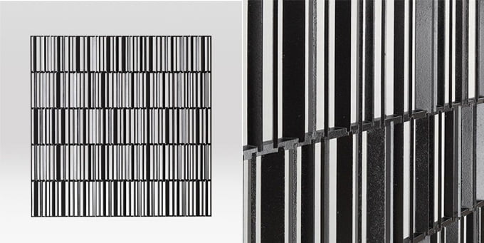 パネルの基本木型枠(400×400)は田の字。その開いている4ヶ所に和柄の型をはめ込み、鋳造を行います。はめ込む柄の組合せは市松びや縦縞並びの伝統的な並びや、柄と柄のつながりの変化を楽しむ格子デザインも出来ます。