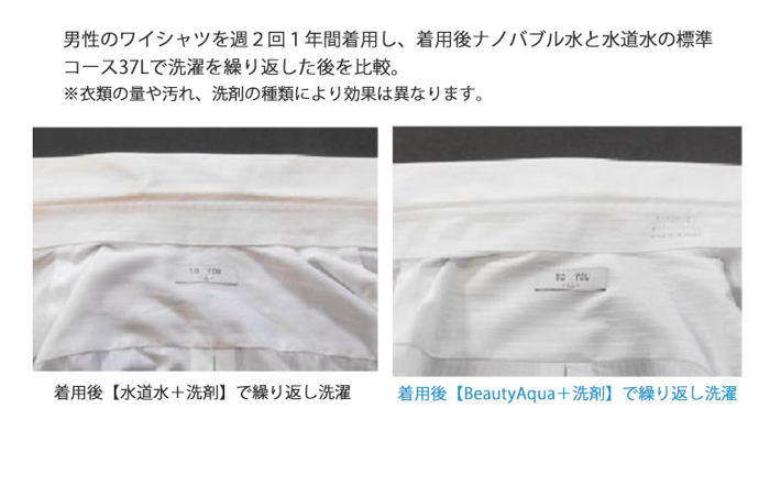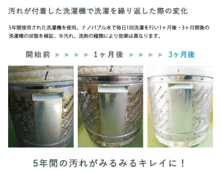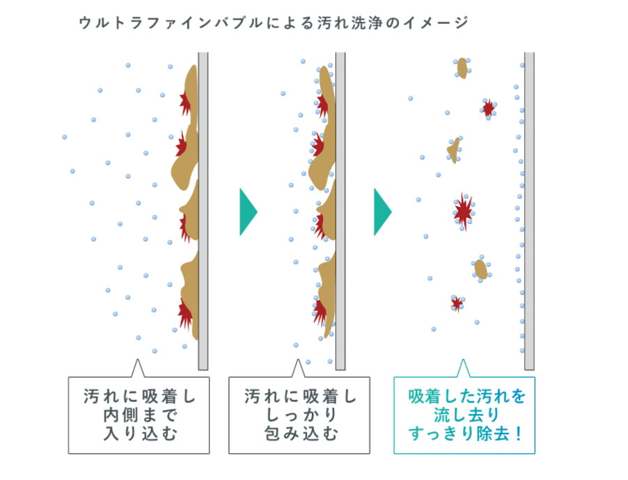 ① マイクロバブル、ナノバブルの小さな泡が、洗剤と一緒に繊維の中に入り、汚れ落ちが、良くなります。
