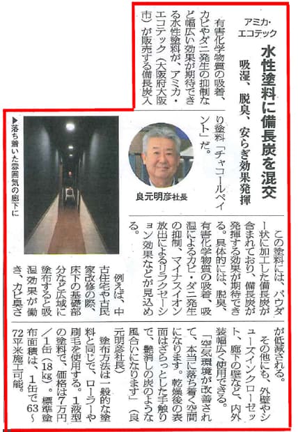 株式会社アミカ・エコテックの取り扱う吸放湿性備長炭塗料『チャコールペイント』が、リフォーム産業新聞に掲載されました。