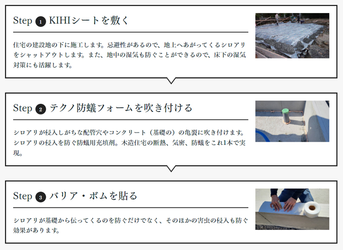 基礎下にKIHIシートを敷くことによって侵入自体をさせません。KIHIシートは名前の通り、シロアリが触れると痺れて動けなくさせる忌避効果によるものです。