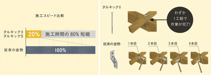 建材ナビ・スタッフからのコメント タルキックIIを使用することで、施工時間がなんと約5分の1に!木割れを防ぎ堅木でも垂直に打ち込みが可能なため現場からの支持が高い製品です。作業負担の大幅な軽減に、是非、ご検討ください!