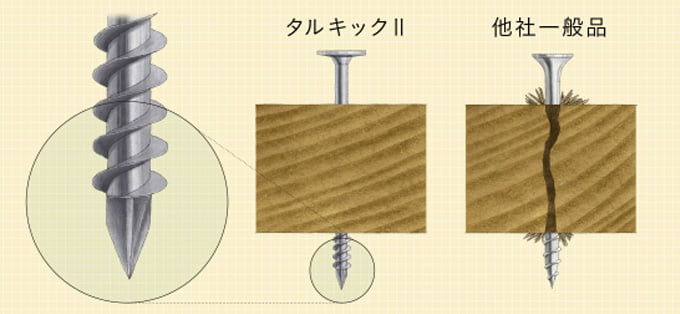 タルキック専用の特殊ドリル刃先が木割れを防止しつつスムーズな施工も実現します。