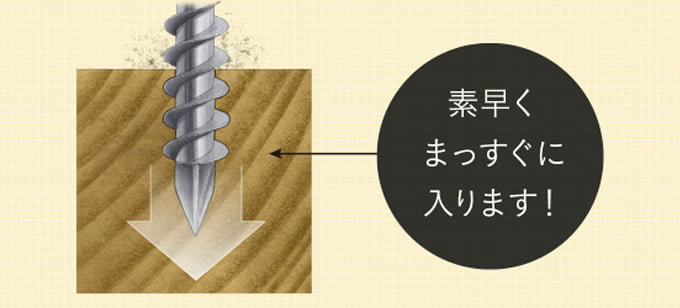また、特殊なねじ形状を採用することで、軽い力で素早く打込みが完了できるようになっています。