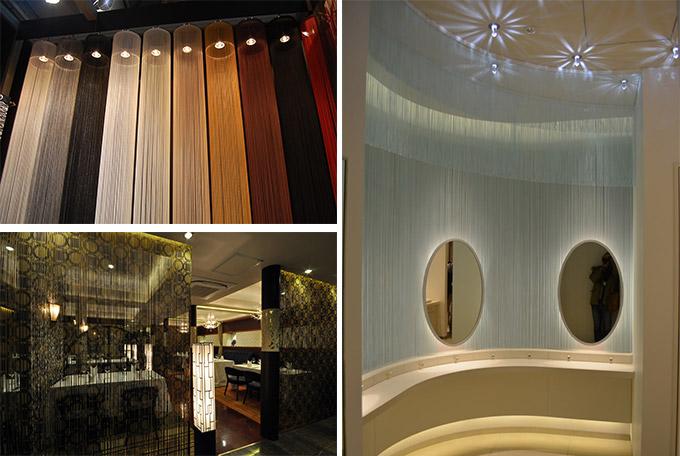 ストリングスカーテンは、日本ではフリンジカーテン、ひもカーテンなどとも呼ばれ、店舗の装飾や窓周りのレースカーテンの代わり、また暖簾のように間仕切りとして使われています。もともとのストリングスカーテンはドイツ生まれ。住宅の窓、ベッドルームの天蓋、間仕切りとしてスタートしました。日本へ輸入されるようになったのが20年以上前ですが、防炎性能、在庫対応、特注対応などの課題が残されていました。