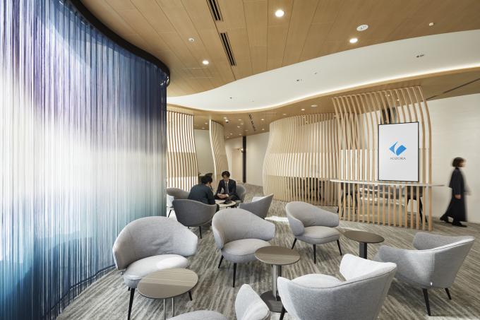 東京・日本橋にある銀行の待合の窓面に設けられたラインビューのデジタルプリント。デザインコンセプトとしては、窓の外を流れる川の川面の光り輝く様をラインビューで表現したい、というところから始まりました。日中は外光とプリント柄とが上手に組み合わさり、光り輝く様子が上手に表現できたのではないかと思います。ちなみに室内側はラインビューのデジタルプリント、窓側はグレーのシアーカーテンに同じ柄をプリントした二重構成となっています。