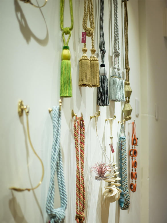 ファブリック、トリミング類、タッセル、カーテンレール、レザータイルなど、実物に触れることで質感や色合いをより良く感じ取っていただけることでしょう。上質な商品の数々をぜひお楽しみください。