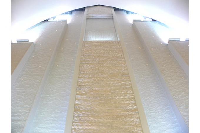 当社独自のエッチング加工により水はねがほとんどありません。また、二重エッチングで盤面にロゴや柄、光ファイバーを加えることで埋め込むことも可能です。流水面をライトアップすることでより水模様が際立ち存在感が増します。