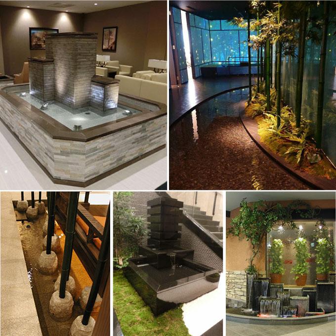 ■疑岩風の滝やデザインされた水盤、アクセントに各種噴水、高低差を活かした水の流れを演出するカスケードといった水本来の動きを演出します。