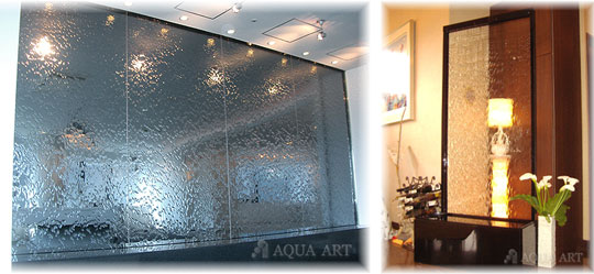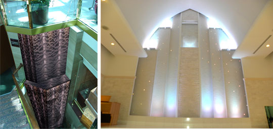 流水面に特殊処理を施し前面を被うように流す技術です。流量の調整も出来ます。オープンスペースなどの演出には特に適しています。ガラス面に特殊処理を施し水の流れを作り循環させています。