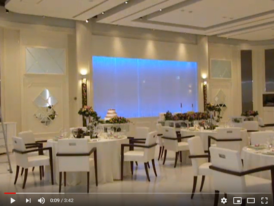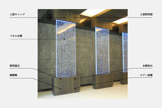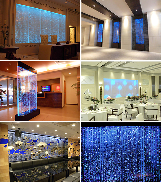 株式会社アクア・アートが取り扱う「アクアスクリーンパネル」は、水のピュアな透明感とエアーのバイブレーションが優雅な印象を与えてくれます。そして華やかなライティングがひときわ空間を際だてます。