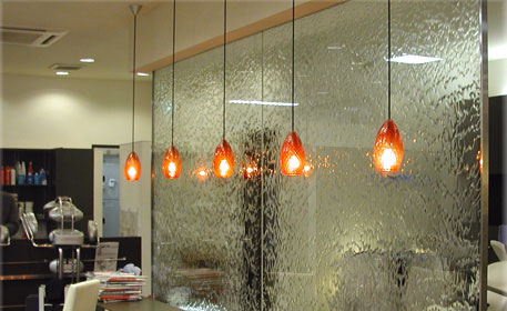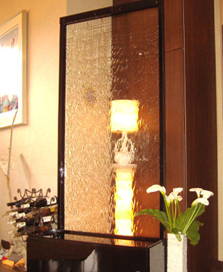 ■オープンスペースなどの演出には特に適しています。ガラス面に特殊処理を施し水の流れを作り循環させています。流れの速度やパターンは制御可能です。