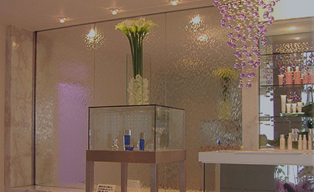 ■オープンスペースなどの演出には特に適しています。ガラス面に特殊処理を施し水の流れを作り循環させています。流れの速度やパターンは制御可能です。