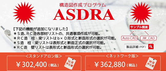 ◆構造図一括作成プログラム≪ASDRA≫に、多彩な機能が追加されました。 ※「ASDRA」とは、”ASCAL ”を始めとする弊社ソフトの特徴でもある、グリッドフリー軸形状の3次元モデルで作成される計算データを基に、自動で基礎伏図、伏図、軸組図、部材リスト等の構造図データを”AutoCAD ”,”Jw_cad ”用に変換し、書き出すプログラムです。 詳細はこちらから