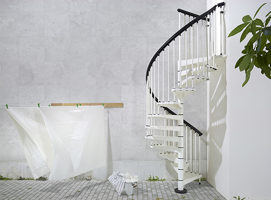 従来の亜鉛メッキ仕上げの上から、白、黒、グレーの焼付塗装を施したダブルコーティング仕様で、より美しく、より強い屋外用螺旋階段が完成いたしました。塩害の強い沿岸地域のバルコニーや屋上にも自信を持っておすすめいたします。