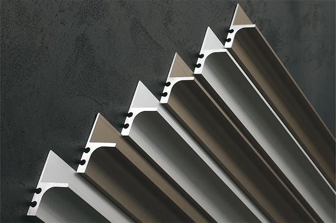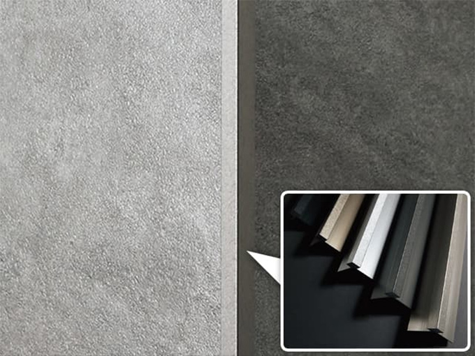 バイブレーションによる抑制された光沢と輝きがアルミ押出し無垢材の肌に息づいています。不燃化粧板のリアルな質感と表現力をシャープに引き締める壁見切りジョイナーです。AFOLA「Verta J」不燃化粧板用 壁見切りジョイナー