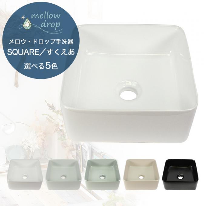 SQUARE(すくえあ)はカウンターの上に乗せて設置するベッセル型の卓上手洗器です。横幅310mm×奥行310mm×高さ130mm、オーバーフローはありません。トイレや玄関などの手洗用としてご使用いただけます。組み合わせる蛇口は、吐水高170~250mm程度が手洗いしやすくおすすめです。