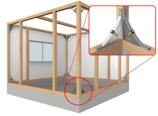 ■3枚のバネが揺れを吸収し、またバネの形状記憶により、歪んだ建物を元に戻す「復元機能」が、繰り返しの余震に効果を発揮します。