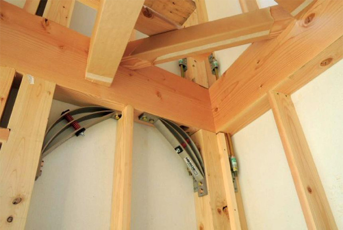 固めることにより壊れたものはもとに戻りませんが、アールの異なった3枚のバネは非常に壊れにくく、特に、速い速度を持つ力に対しては、より大きく抵抗しながら衝撃吸収能力を発揮します。柱に設置した左右、上下の3枚バネが互い違いに動くことで、倒れようとする力は元に戻ろうとする「復元力」となり、揺れを小さくする効果があるのです。