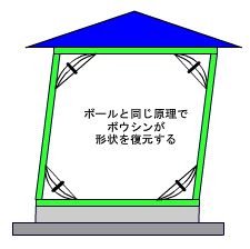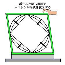 ■固めることにより壊れたものはもとに戻りませんが、アールの異なった3枚のバネは非常に壊れにくく、特に、速い速度を持つ力に対しては、より大きく抵抗しながら衝撃吸収能力を発揮します。柱に設置した左右、上下の3枚バネが互い違いに動くことで、倒れようとする力は元に戻ろうとする「復元力」となり、揺れを小さくする効果があるのです。