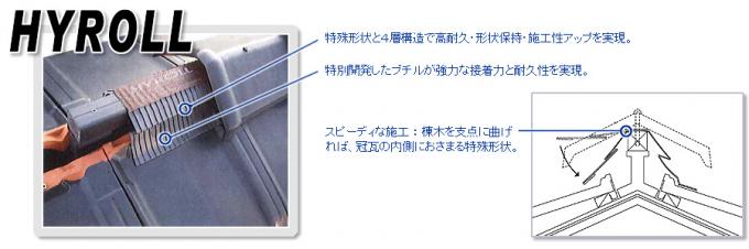 耐久性・耐候性・耐震性に優れた各種漆喰材、屋根土を使用しない「乾式面戸ハイロール(HYROLL・HYROLL AIR)」は大手ハウスメーカー様や屋根材メーカー様にお使いいただいております。このハイロールは、特殊形状と4層構造で高耐久・形状保持・施工性アップを可能に。特別開発したブチルが強力な接着力と耐久性を実現しました。